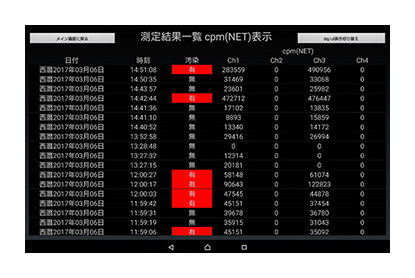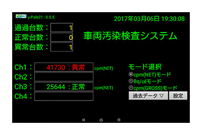 表示内容 | 日時/環境バックグラウンド計数率/通過台数/判定台数(警報値未満、以上)/検出器ごとの判定結果/判定時の正味計数率、警報値 |